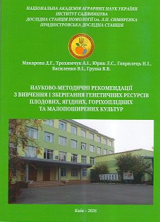Науково-методичні рекомендації з вивчення і зберігання генетичних ресурсів плодових, ягідних, горіхоплідних та малопоширених культур. Вид. 2-ге, переробл. і допов. / Макарова Д.Г., Трохимчук А.І., Юрик Л.С., Гаврилець Н.І., Василенко В.І., Груша В.В.; під заг. ред. Д.Г. Макарової, А.І. Трохимчук. Київ, 2026. 108 с. У рекомендаціях викладено основи наукового вивчення та зберігання цінного генофонду садових культур України. Призначені для використання працівниками наукових та навчальних установ (селекціонерами, сортознавцями, інтродукторами), які займаються веденням генетичних ресурсів рослин плодових, ягідних чи інших багаторічних рослин. |
